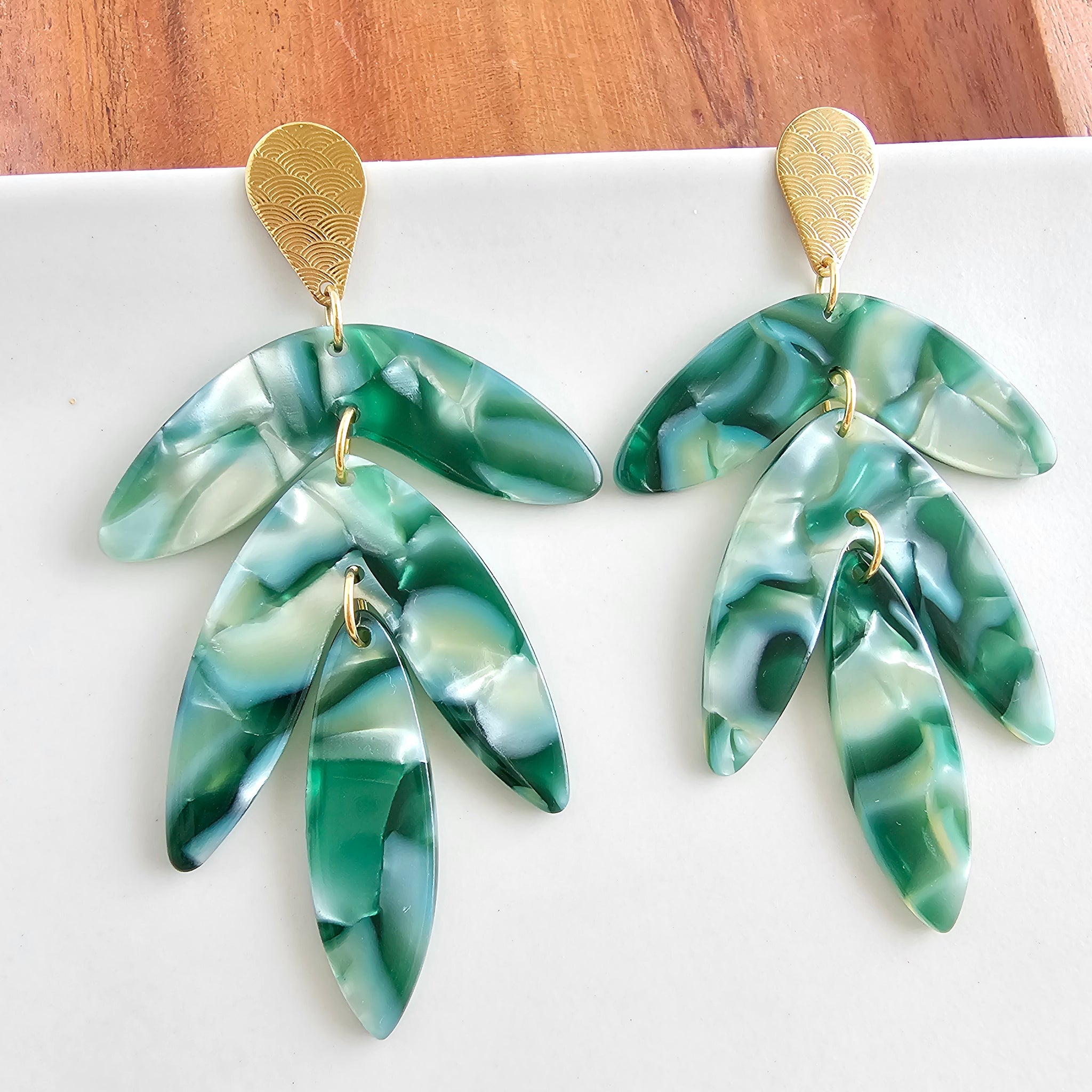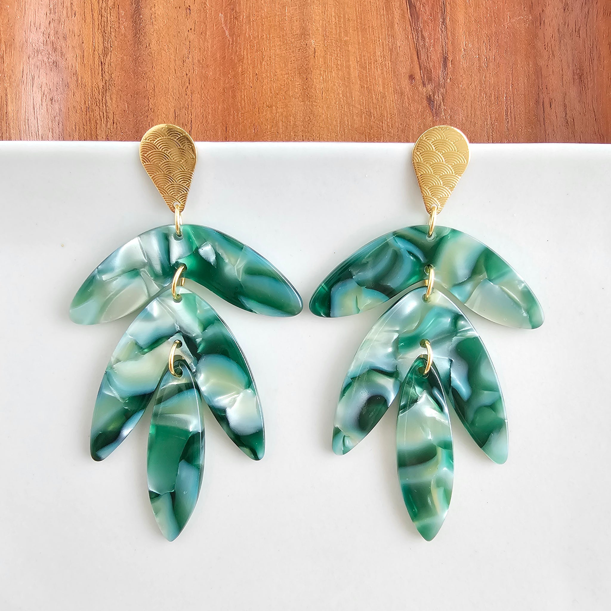 Style Tip: Let the Kailani Earrings be your go-to for a vacation-ready look. Pair them with a tropical print sarong and a simple tank for a beachside lunch, or style them with a sleek white midi dress to let the gold accents and tropical design pop. They are the perfect finishing touch for a summer sunset dinner or your next weekend escape.