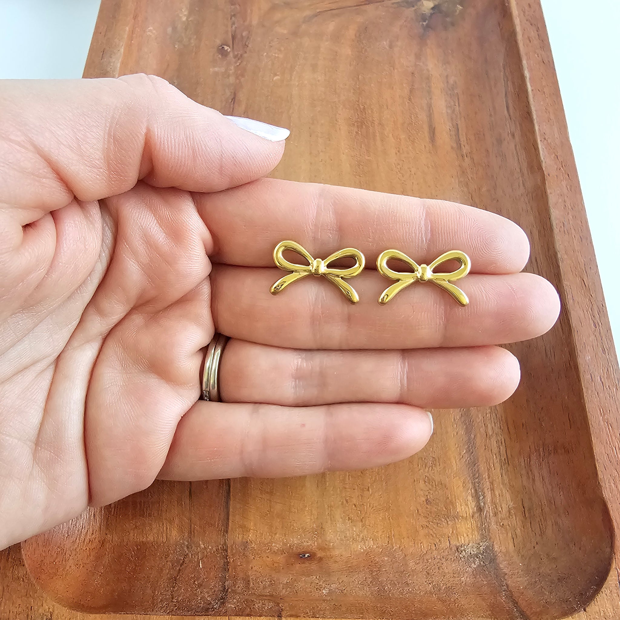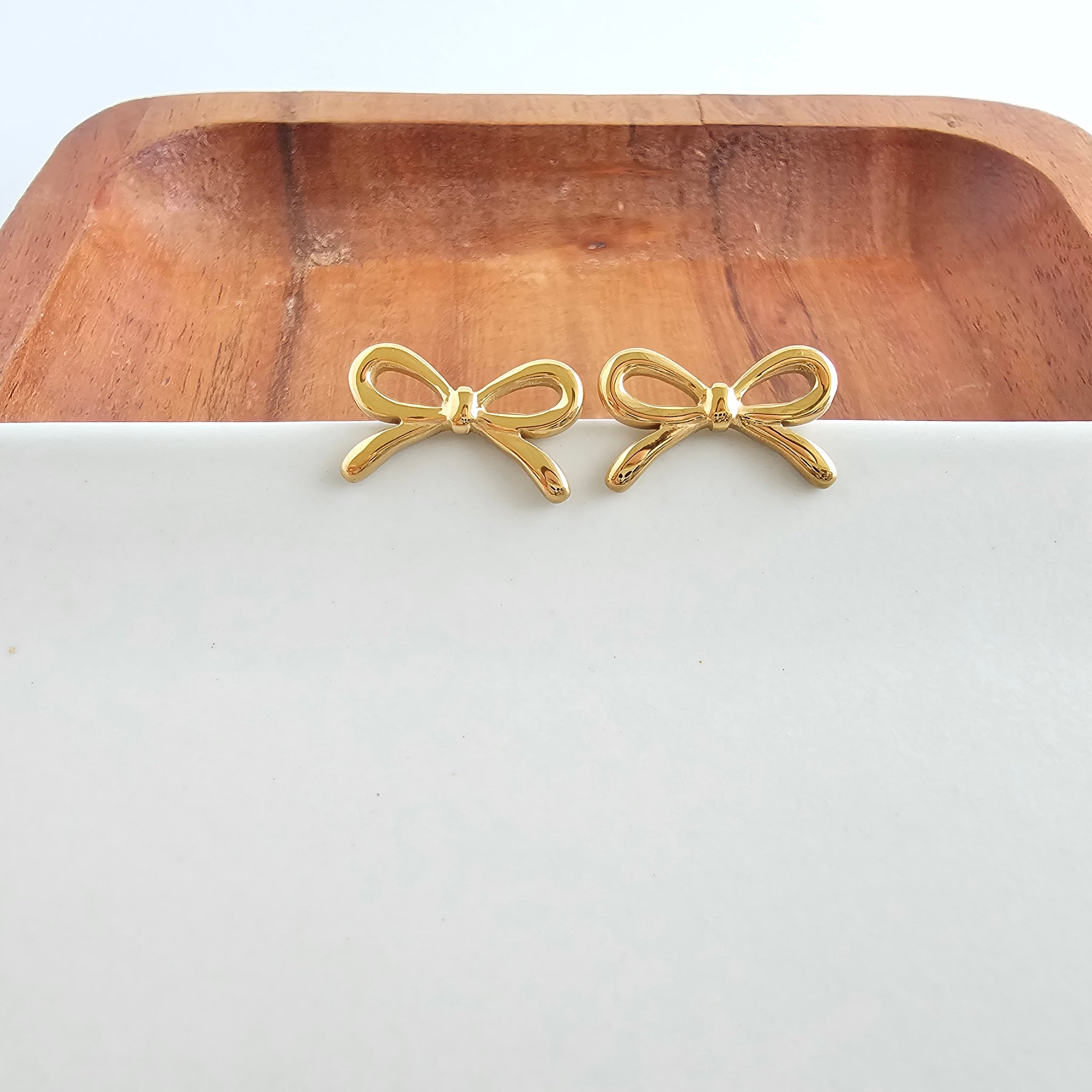 Elevate your everyday charm with the Luxe Gold Bowie Studs. This premium version of our Bowie design is crafted for those who love a touch of feminine sophistication with a high-end finish. These studs feature a delicate bow silhouette in a radiant gold shine, offering a timeless and polished look that seamlessly transitions from a casual day out to an elegant evening event.