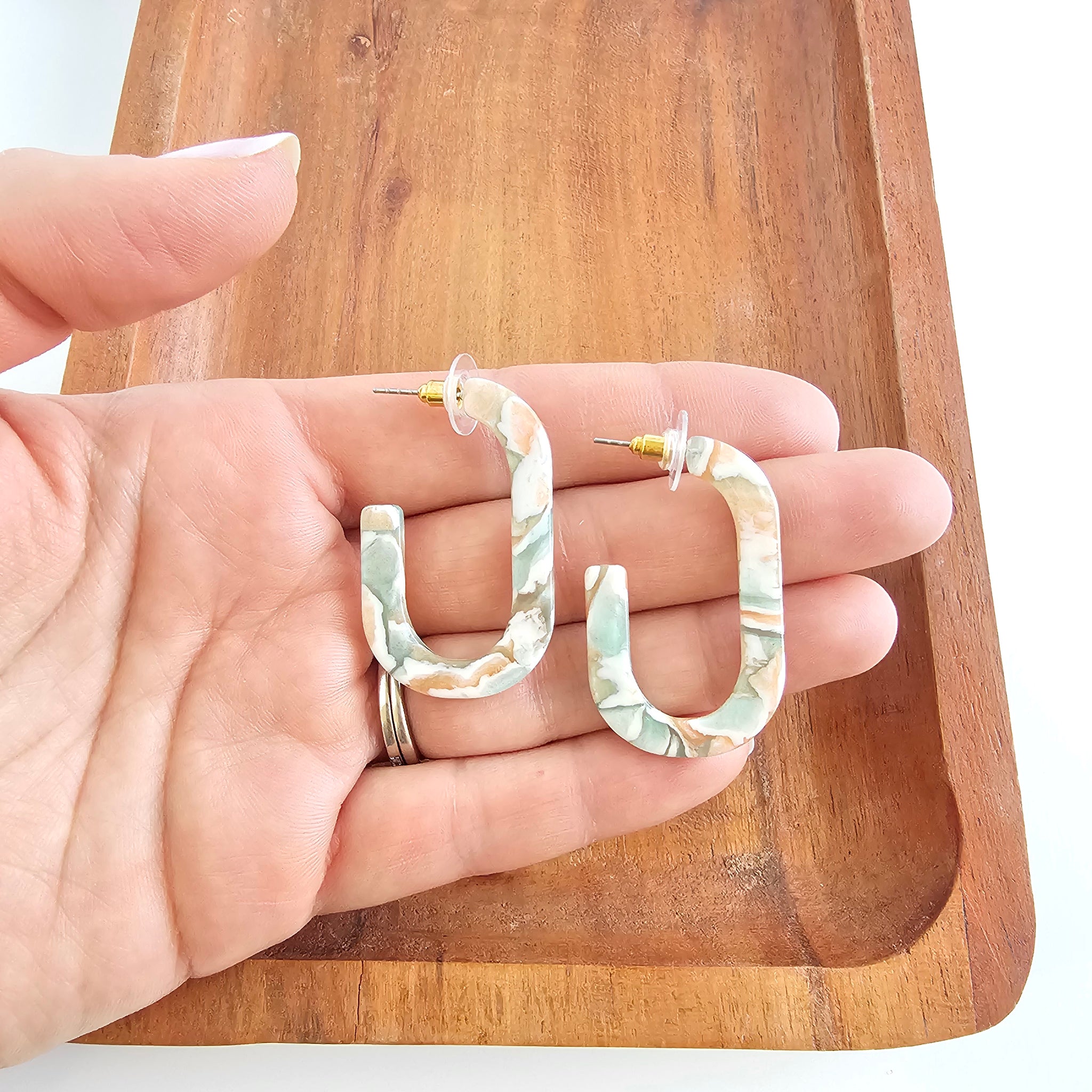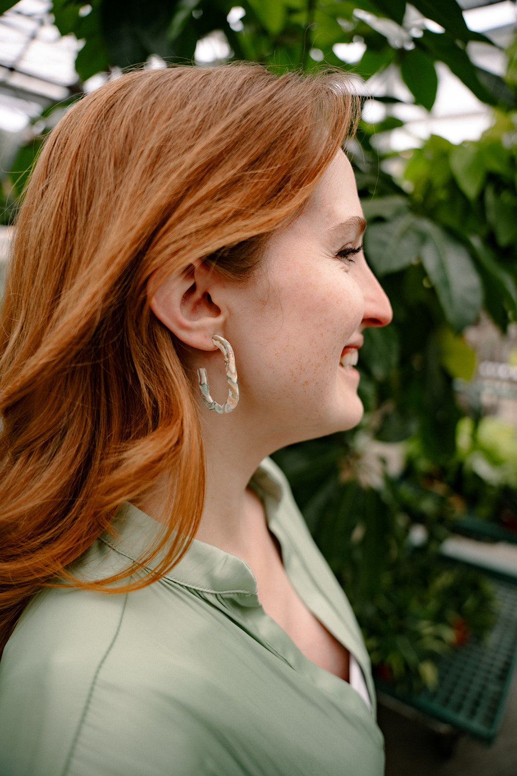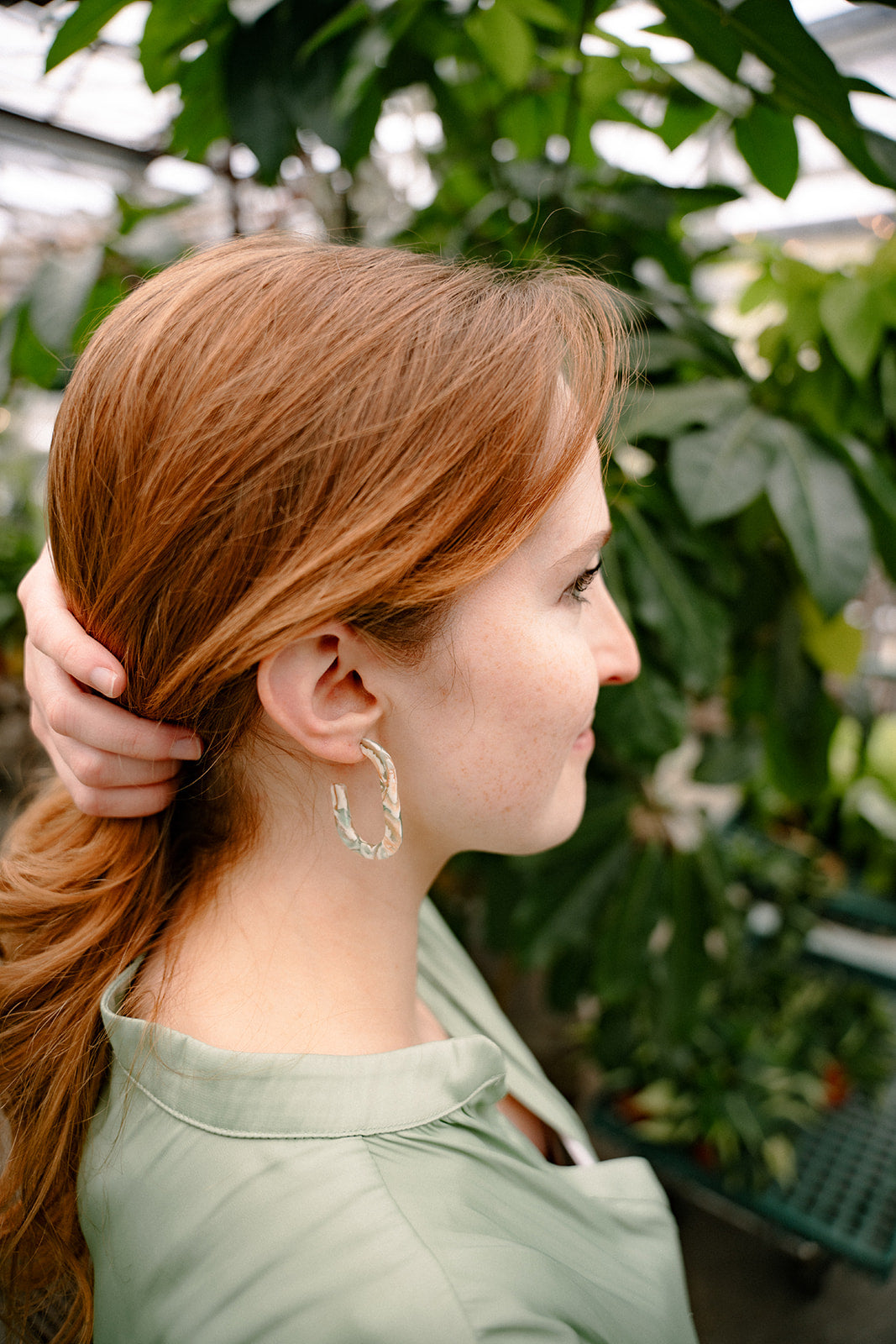 Style Tip: Let the Jenna Hoops be your go-to for effortless styling. Pair them with a breezy eyelet top and your favorite denim for a classic daytime look, or wear them with a sleek slip dress for a dinner out. Their curved profile adds a touch of sophisticated flair that complements everything from a messy beach bun to a polished ponytail.