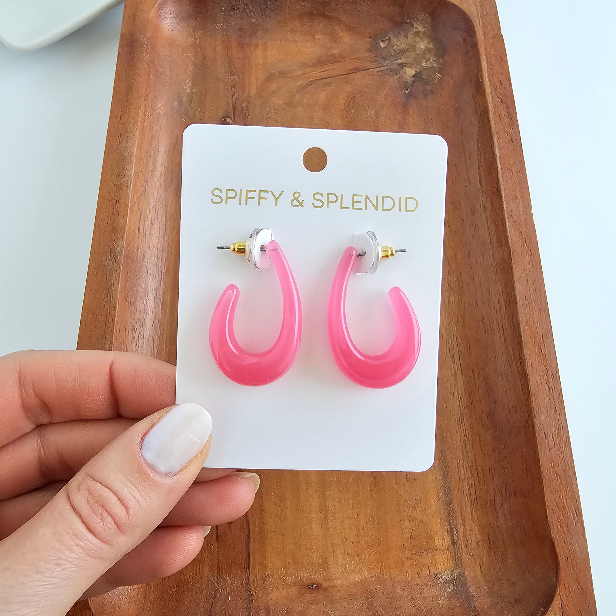 Add a splash of vintage-inspired charm to your jewelry box with our Julie Hoops. These earrings feature a bold, curved silhouette crafted from a chunky, retro resin that captures a playful spirit. Designed to make a statement all day long.