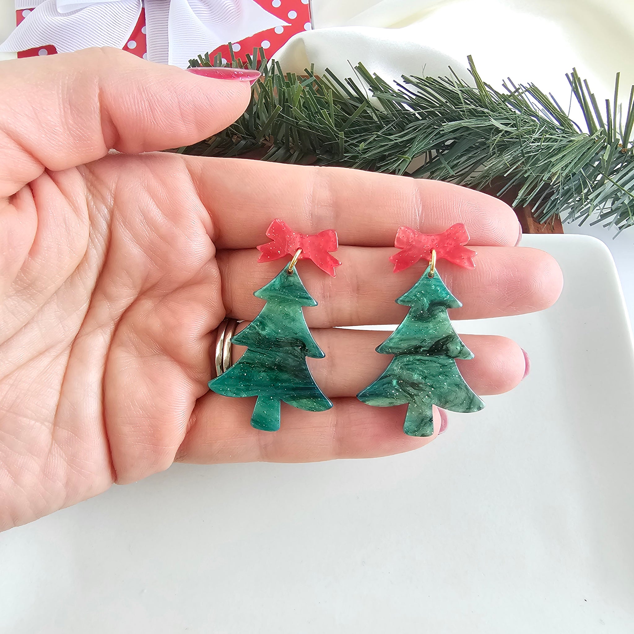 • Load image into Gallery viewer, Bow Christmas Tree Earrings - Green Shimmer